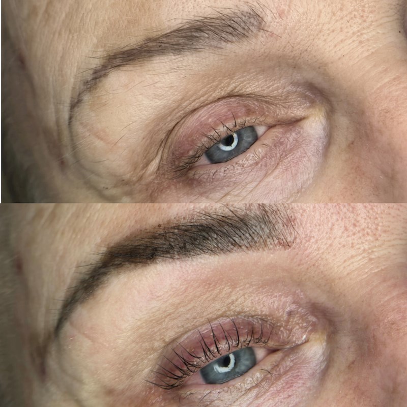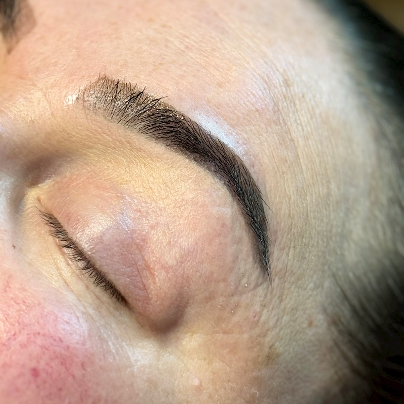 I brynslaminering blir øyebrynet løfter og greg opp med ulike perm produkter , og med dette skapes det en illusjon om et tykkere od mer velformet bryn .